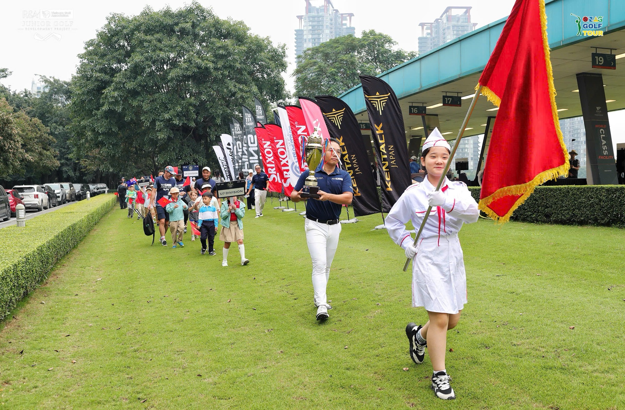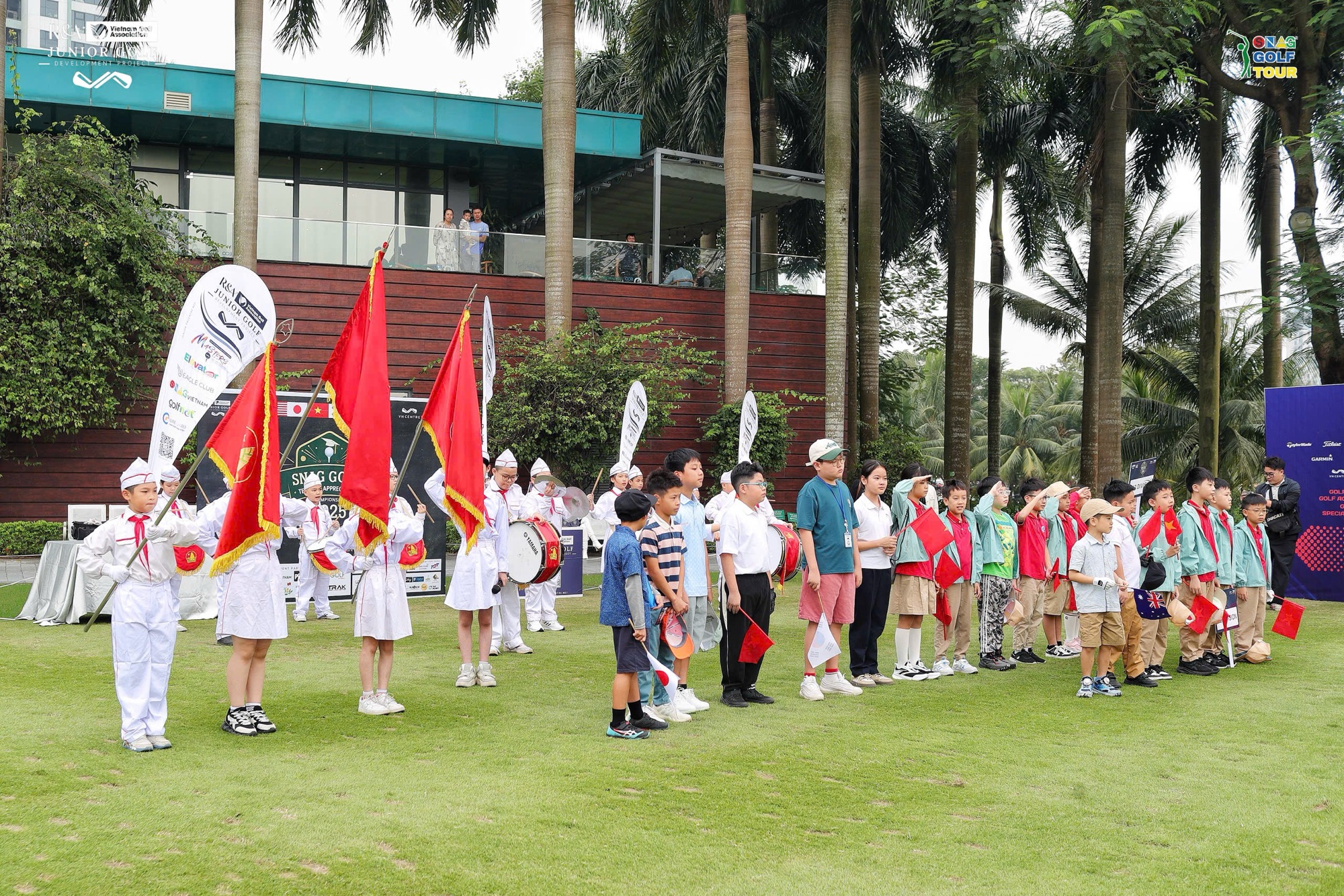 Mở màn cho ngày thi đấu là tiếng trống nghi thức đầy hùng tráng của đội nghi thức trường Tô Vĩnh Diện, vang lên trong không khí mát lành của một buổi sáng mùa thu. Khi tiếng quốc ca cất lên, ánh mắt tự hào của các golfer nhí – những mầm non của đất nước – khiến không khí trở nên trang trọng và xúc động hơn bao giờ hết.
