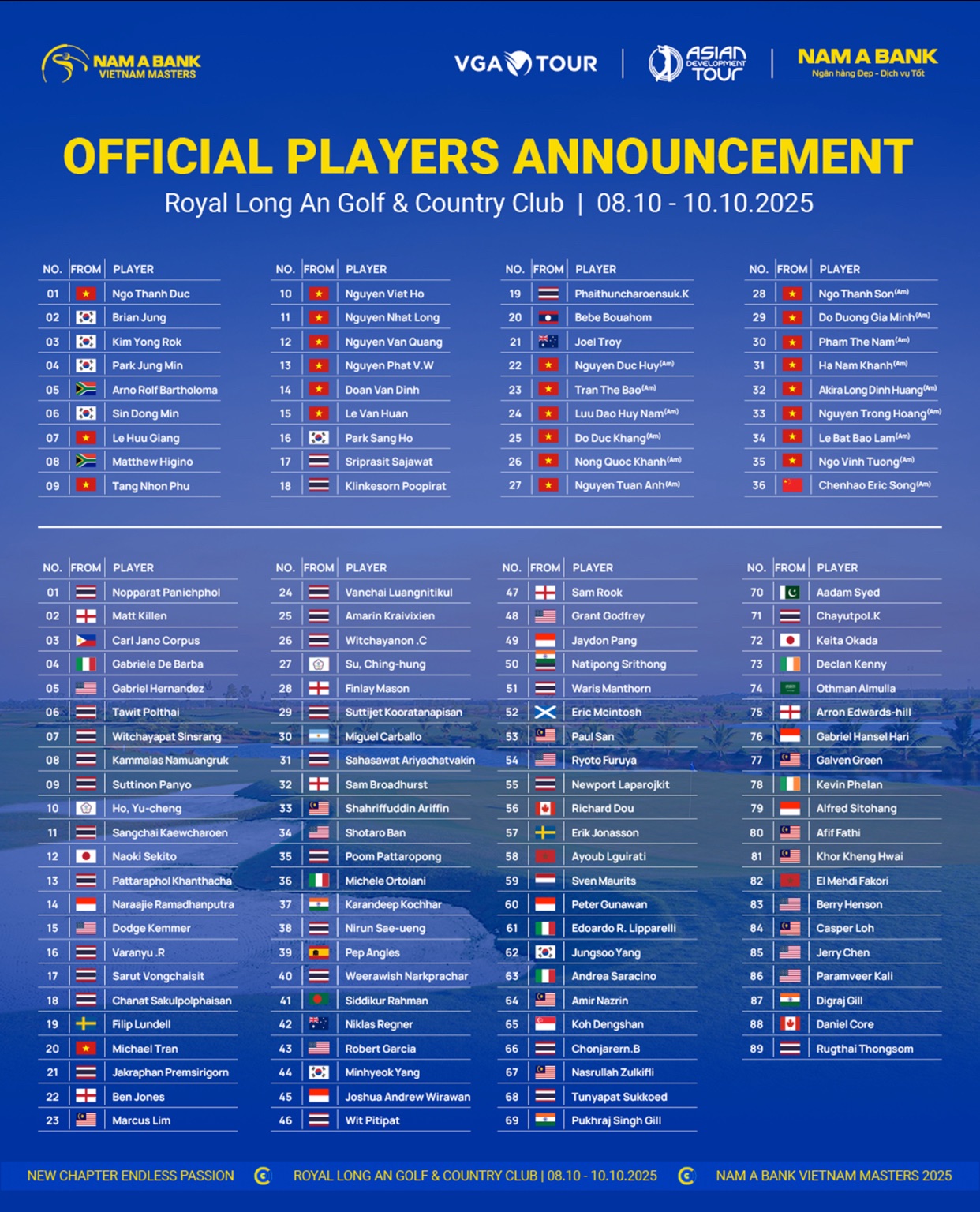Mùa giải năm nay quy tụ 125 vận động viên đến từ nhiều quốc gia. Trong đó, 36 đại diện Việt Nam (gồm các vận động viên thuộc VGA Tour và những tài năng trẻ nghiệp dư trong nước) cùng 89 vận động viên đến từ ADT.