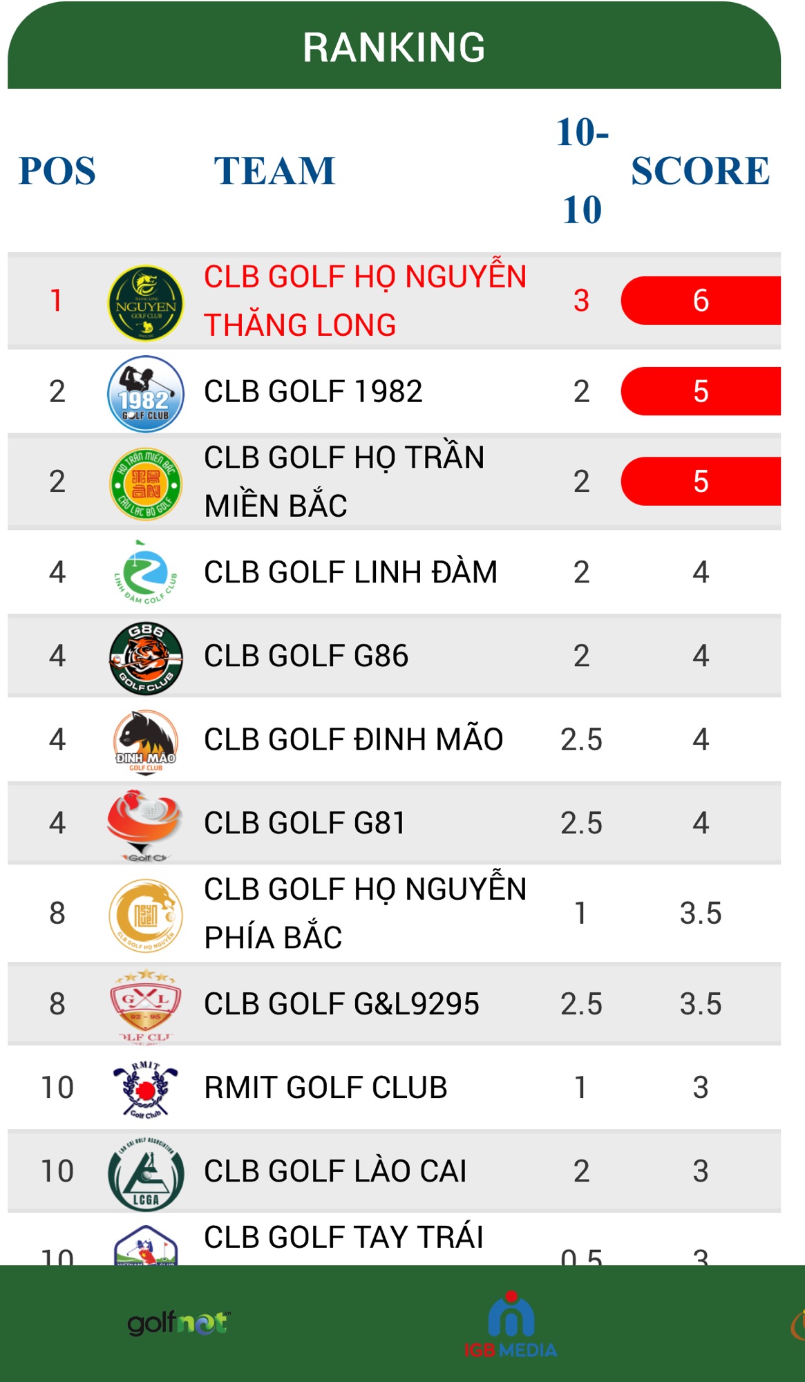 Xếp sau 3 CLB trên là Họ Nguyễn phía Bắc và CLB Golf Tay trái Việt Nam, với cùng 2,5 điểm. Kết quả này sẽ khiến cuộc đua vô địch hấp dẫn hơn trong ngày thi đấu thứ 2, khi mỗi CLB còn 3 trận Fourballs và 6 trậ Singles Match. Ngay cả các đội đang có cùng 2 điểm như G86, Luật sư miền Bắc, Hoa Phượng Fellowship, RMIT và Linh Đàm cũng còn nhiều cơ hội cạnh tranh.