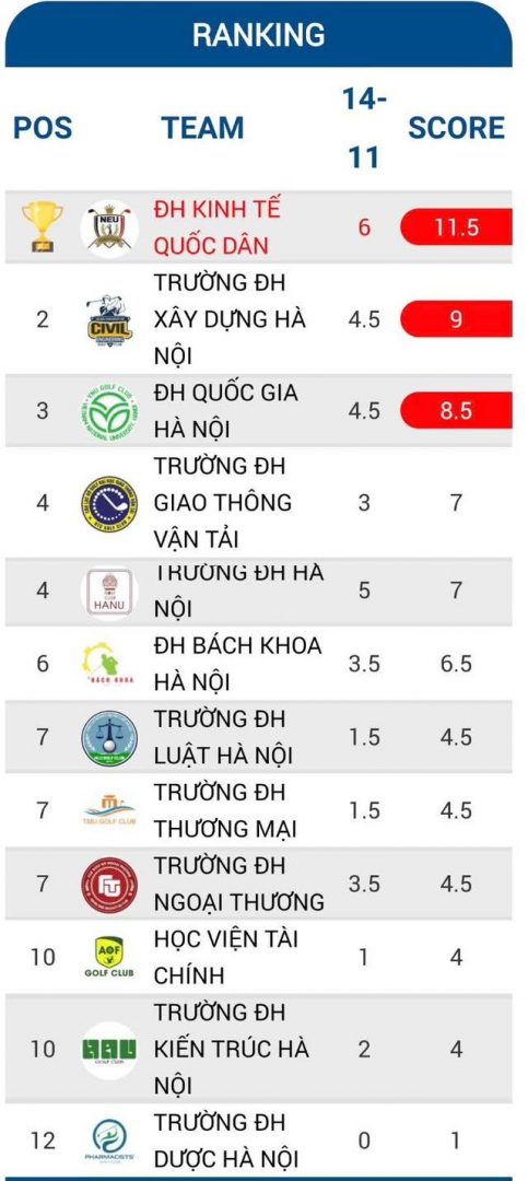 Hai vòng đấu bất bại trên sân Tam Đảo với tổng điểm 11,5 các tuyển thủ CLB cựu sinh viên Đại học Kinh tế Quốc dân (NEU Golf) đã đi vào lịch sử giải đấu – nhà vô địch có điểm số tốt nhất.