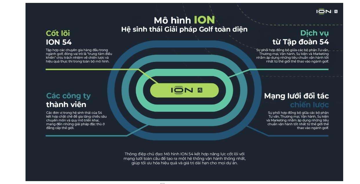 ION 54 là nền tảng giải pháp golf tích hợp toàn cầu do 54 phát triển. Bằng cách kết nối và phối hợp toàn bộ các khâu trong chuỗi giá trị của ngành golf, từ tư vấn đầu tư và thị trường vốn, tư vấn chiến lược, phát triển bền vững, phát triển & xây dựng, marketing & sáng tạo, nông học, tiền khai trương & quản lý câu lạc bộ, cho đến bán hàng & du lịch. ION 54 mang đến mô hình triển khai trọn vẹn đầu tiên trong ngành, với trách nhiệm rõ ràng, nhằm tối ưu hiệu quả vận hành và giá trị dài hạn cho các khoản đầu tư, dự án phát triển và những điểm đến golf đẳng cấp quốc tế.